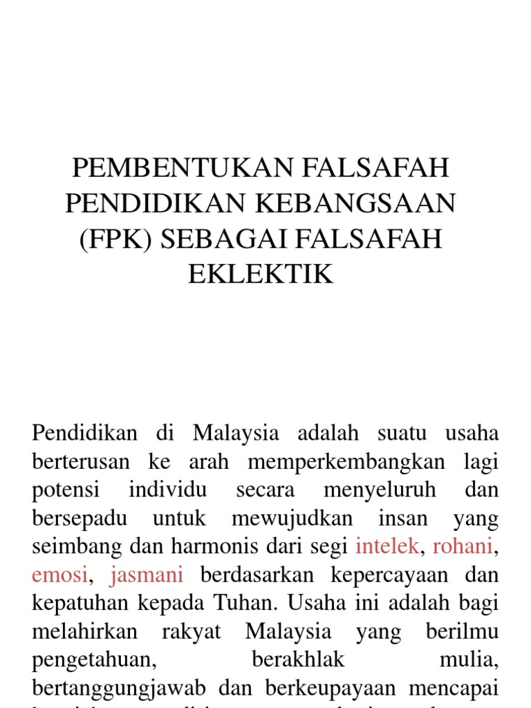 I pendahuluan falsafah pendidikan kebangsaan (fpk) dan falsafah pendidikan guru (fpg) menekankan kepada perkembangan potensi individu guru secara seimbang dan bersepadu dari segi jasmani, emosi, rohani dan intelek. Falsafah pendidikan kebangsaan sememangnya sangat penting kepada setiap guru sebagai panduan bagi mereka dalam membantu mereka menjalankan sesi pengajaran dan pembelajaran. Konsep existentialisme ilmu dan kuasa. Sehubungan dengan itu, pentingnya seseorang guru untuk memahami falsafah pendidikan. Kecuali untuk yang kuliah jurusan hukum, pendidikan pkn atau sejarah.