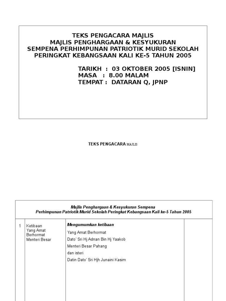 Teks Pengerusi Majlis Makan Malam from imgv2-2-f.scribdassets.com Hotel allason klana resort, seremban, negeri sembilan. Mengumumkan ketibaan timbalan menteri pelajaran 1, kementerian pelajaran malaysia, yb. Mar 30, 2013 · skrip majlis makan malam. Penaung :yab dato seri utama haji mohamad bin haji hasan, menteri besar negeri sembilan. Yang berbahagia dato' hajah kamilia bt. More images for skrip pengacara majlis makan malam » Sep 26, 2014 · teks. See full list on itubabam.blogspot.com